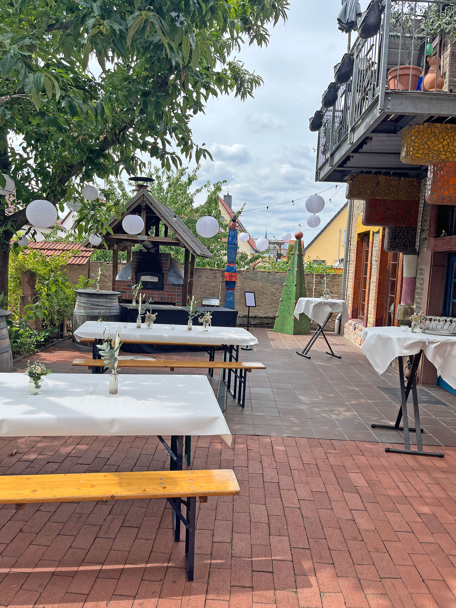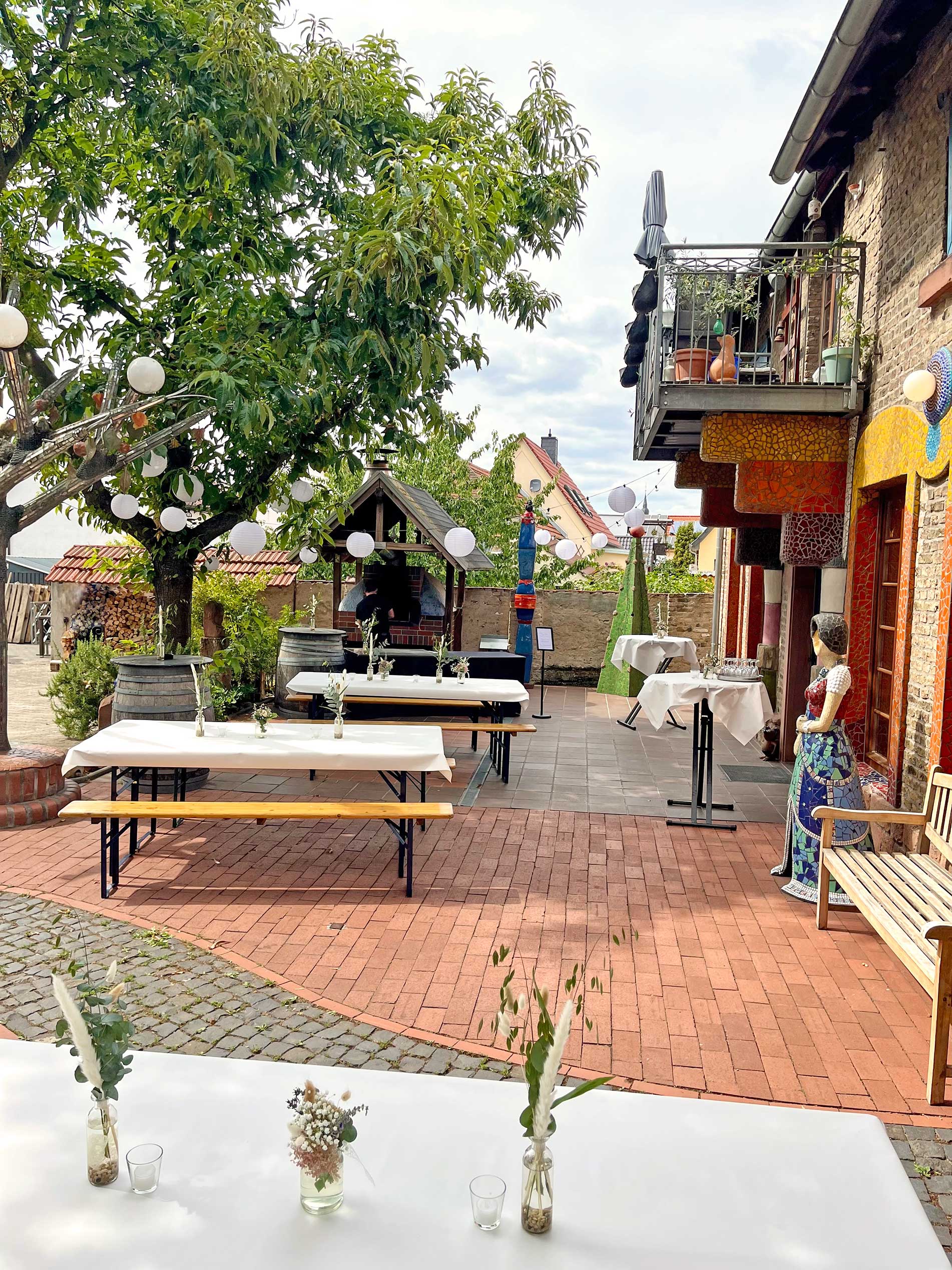 Auf unserer Großzügigen Terrasse gespickt mit diversen Kunstobjekten stehen Ihnen diverse Stehtische zur Verfügung, die für einen lockeren Empfang Ihrer Gäste genutzt werden können.